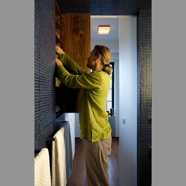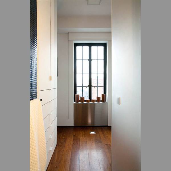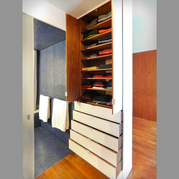 White painted walls and doors, conceal lush interiors of oiled walnut, enclosing libraries, artwork, office supplies, clothing and precious mementos.